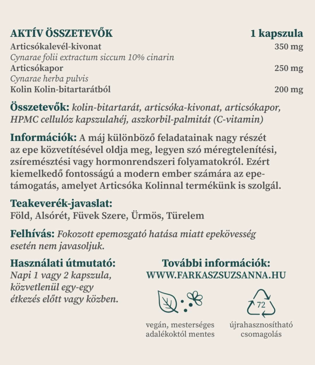 Ezért is választottam az articsókát és a kolint is az epetámogató készítményünkbe. Az articsóka cinarin-tartalmánál fogva elősegíti az epefolyadék termelődését, míg a kolin esszenciális tápanyagként elősegíti a koleszterin epébe történő kiválasztását, ami fontos a zsírok emésztéséhez és a méreganyagok eltávolításához.