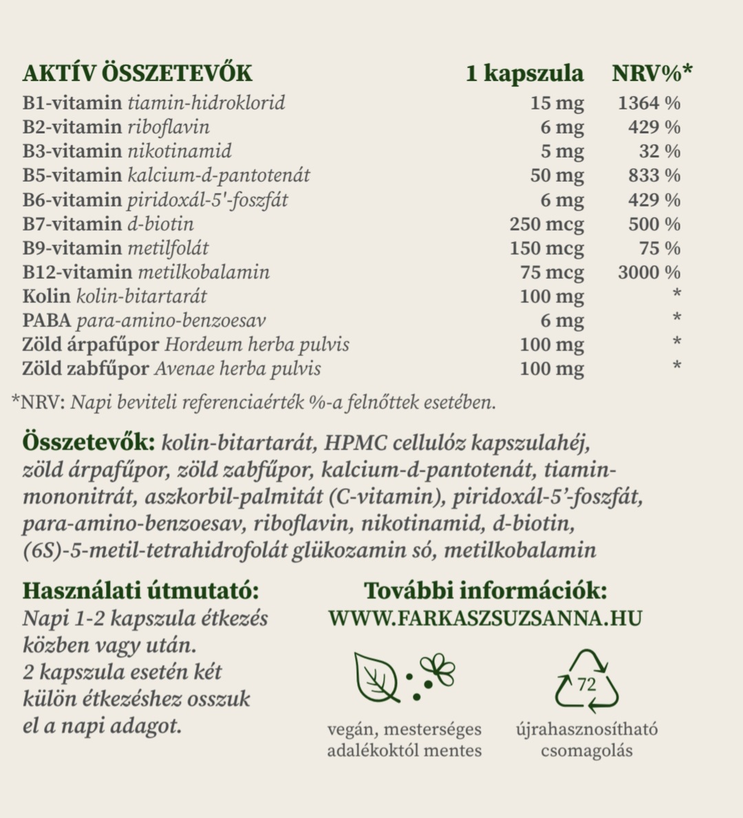 A vágyam az volt, hogy egy olyan B-komplexet alkossak meg, amely nemcsak minőségi b-vitamin formákat tartalmaz, hanem üzenetet is hordoz a modern ember számára. Azért is választottam a zöld árpafüvet és zöld zabfüvet a B-vitaminok ágyának, hogy erősítsem a mindennapi zöldek fogyasztásának fontosságát, és valódi kontextust biztosítsak a vitaminoknak. A zöld árpafű és zöld zabfű pedig természetünknél fogva bővelkednek b-vitaminokban.