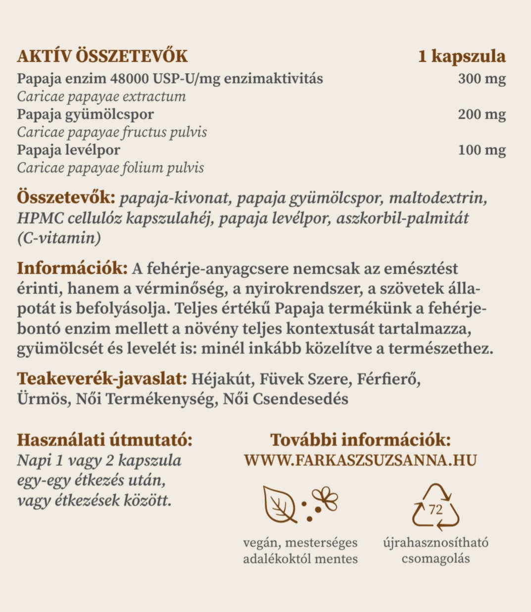 papaja-kivonat, papaja gyümölcspor, maltodextrin, HPMC cellulóz kapszulahéj, papaja levélpor, aszkorbil-palmitát (C-vitamin)
